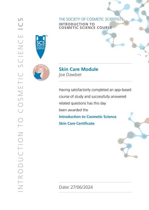 Completed the Skin Care module on the Society of Cosmetic Scientists (SCS) Introduction to Cosmetic Science (ICS) course and passed the module test.