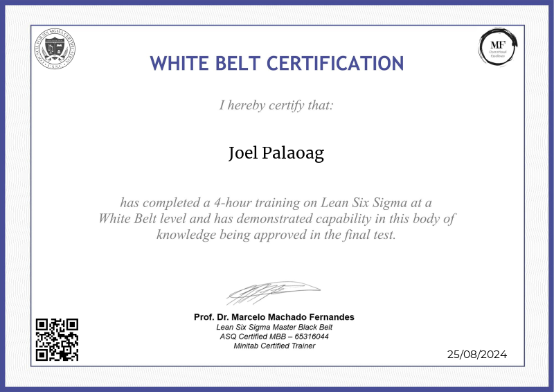 Unlocking the foundational principles of Lean Six Sigma, the White Belt certification offered by MF OPEX, led by Professor Marcelo Fernandes, stands as a beacon of excellence in operational training. Through a comprehensive curriculum blending theory with practical application, participants gain invaluable insights into waste reduction, variation management, and continuous improvement. Professor Fernandes' expertise infuses the program with industry-leading practices, equipping learners with the knowledge and skills to drive tangible improvements within their organizations. Serving as a catalyst for professional growth, this certification paves the way for further advancement in the field of operational excellence, empowering individuals to become agents of positive change in their respective industries.