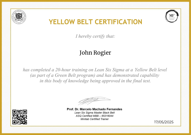 Delving into the intermediate principles of Lean Six Sigma, the Yellow Belt certification provided by MF OPEX, guided by Professor Marcelo Fernandes, marks a significant progression in operational excellence training. Through a meticulously structured curriculum blending advanced theories with practical application, participants deepen their understanding of process optimization, advanced data analysis, and project leadership. Professor Fernandes' renowned expertise enriches the program with cutting-edge methodologies, empowering learners to spearhead impactful improvements within their organizations. Serving as a pivotal milestone in professional development, this certification not only opens doors to larger-scale projects but also fosters the confidence and skills needed to drive transformative change across diverse industry landscapes.