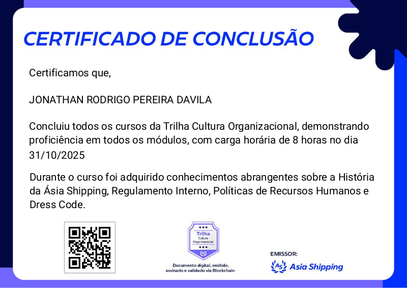 A Trilha Cultura Organizacional é mais um badge do programa de certificação da Ásia Shipping. Nela você terá a oportunidade de conhecer sobre a História da Ásia Shipping, além do Regulamento Interno, Políticas de Recursos Humanos e orientações de Dress Code.