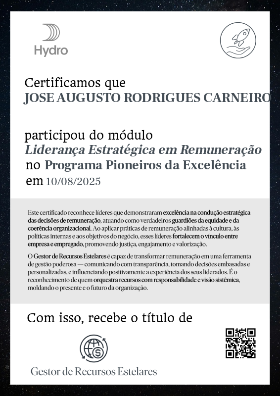 Gestor de Recursos Estelares é capaz de transformar remuneração em uma ferramenta de gestão poderosa — comunicando com transparência, tomando decisões embasadas e personalizadas, e influenciando positivamente a experiência dos seus liderados. É o reconhecimento de quem orquestra recursos com responsabilidade e visão sistêmica, moldando o presente e o futuro da organização.