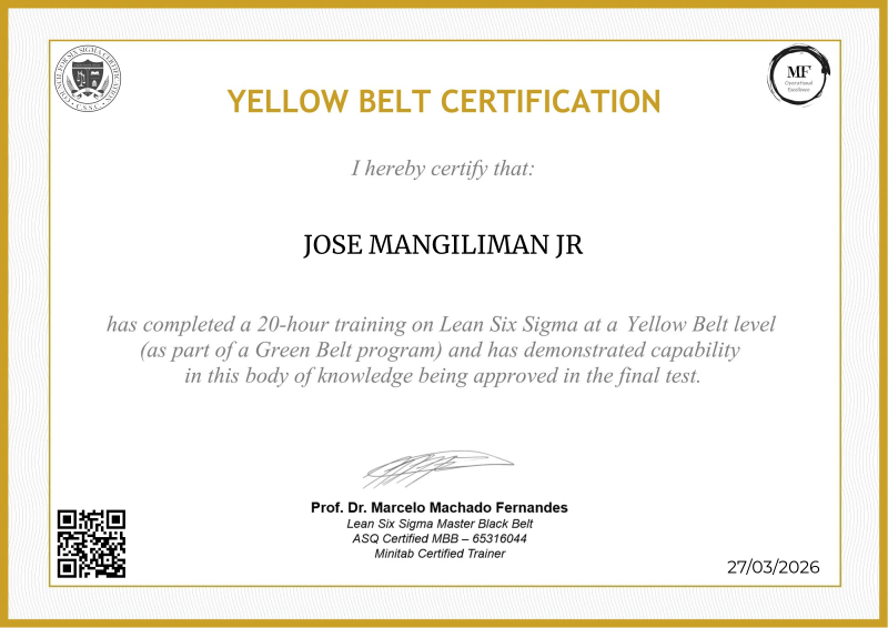 Delving into the intermediate principles of Lean Six Sigma, the Yellow Belt certification provided by MF OPEX, guided by Professor Marcelo Fernandes, marks a significant progression in operational excellence training. Through a meticulously structured curriculum blending advanced theories with practical application, participants deepen their understanding of process optimization, advanced data analysis, and project leadership. Professor Fernandes' renowned expertise enriches the program with cutting-edge methodologies, empowering learners to spearhead impactful improvements within their organizations. Serving as a pivotal milestone in professional development, this certification not only opens doors to larger-scale projects but also fosters the confidence and skills needed to drive transformative change across diverse industry landscapes.