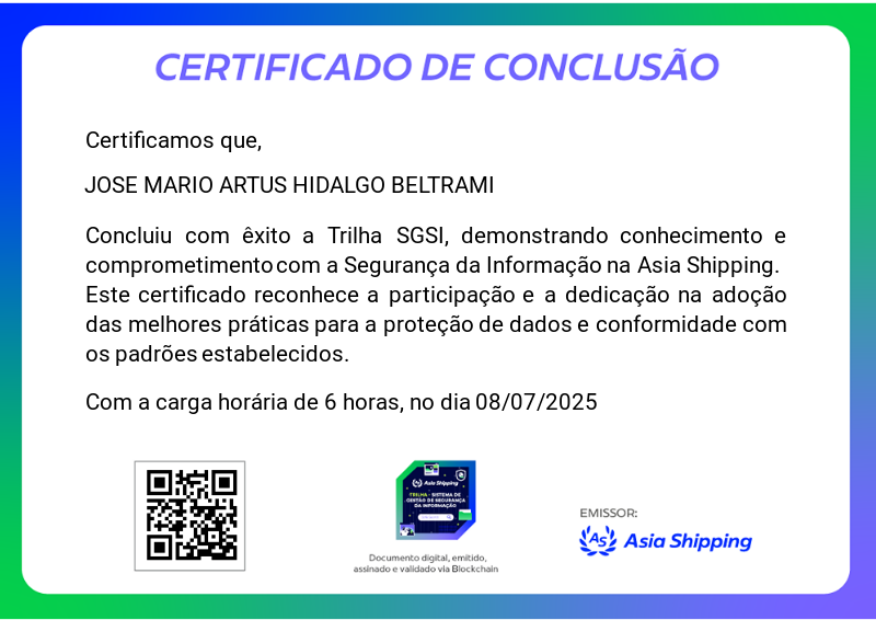 Esta badge é concedida aos colaboradores que completaram com sucesso a trilha de cursos sobre Segurança da Informação, demonstrando conhecimento e compromisso com as melhores práticas de proteção de dados e a conformidade com a política de segurança da Asia Shipping.