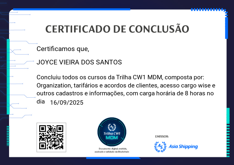 A Trilha CW1 MDM é mais um Badge do programa de certificação da Asia Shipping. Com ela você terá a oportunidade de conhecer melhor sobre as demandas do MDM na Asia Shipping, como ter mais detalhes dos procedimentos de cadastro, com suas etapas e definições.