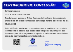 A Trilha Explorando Incoterms inclui elementos relacionados ao comércio internacional, como ícones representando diferentes termos de Incoterms, símbolos de negócios globais ou elementos que destacam a importância do entendimento dos Incoterms para profissionais envolvidos em transações comerciais internacionais. Essa badge serve como um símbolo de conquista e conhecimento na área de comércio internacional e logística.