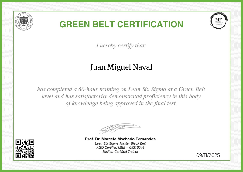Exploring the principles of Lean Six Sigma, the Green Belt certification offered by MF OPEX, under the mentorship of Professor Marcelo Fernandes, represents a pivotal step forward in operational excellence training. Equipped with an extensive curriculum blending advanced theories with hands-on application, participants not only deepen their understanding of process optimization, advanced data analysis, and project leadership but also become adept at spearheading Lean Six Sigma projects. Professor Fernandes' esteemed guidance enriches the program with cutting-edge methodologies, empowering learners to drive substantial improvements within their organizations. Serving as a significant milestone in professional development, this certification not only qualifies individuals to lead larger-scale projects but also instills the confidence and expertise needed to enact transformative change across diverse industry landscapes.