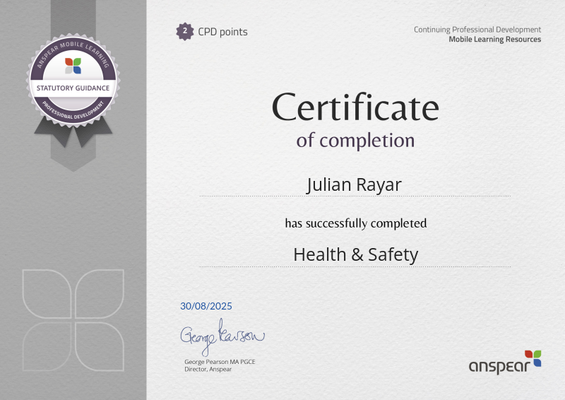Awarded for completing the Health & Safety CPD course from Anspear.