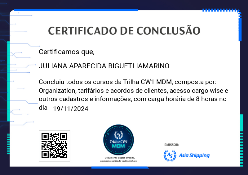 A Trilha CW1 MDM é mais um Badge do programa de certificação da Asia Shipping. Com ela você terá a oportunidade de conhecer melhor sobre as demandas do MDM na Asia Shipping, como ter mais detalhes dos procedimentos de cadastro, com suas etapas e definições.