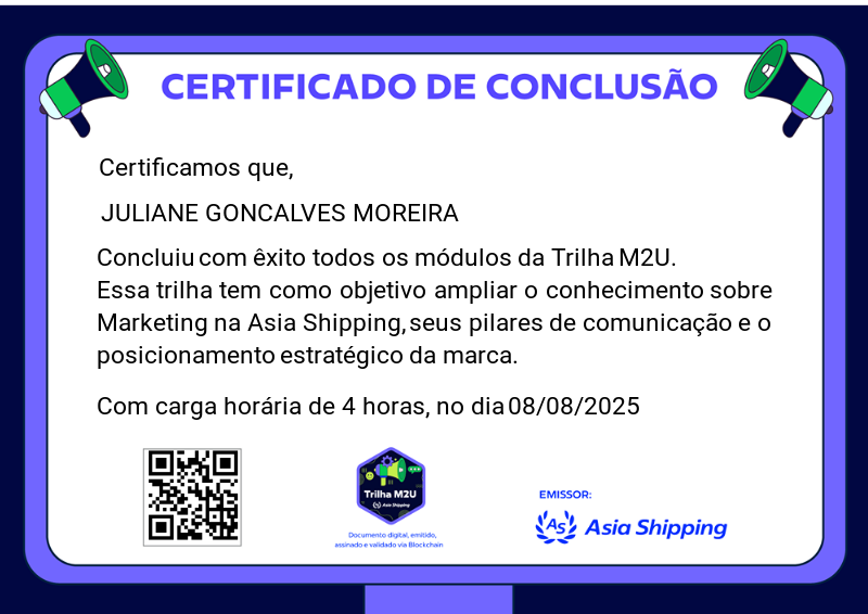 Esta badge é concedida aos colaboradores que completaram com sucesso a Trilha M2U, que teve como objetivo proporcionar uma visão estratégica sobre os pilares da comunicação e do posicionamento da marca, além de fortalecer o entendimento do marketing como ferramenta essencial no contexto organizacional.