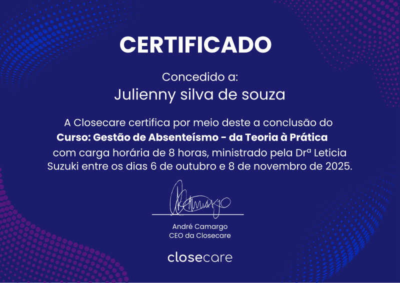 O curso de Gestão de Absenteísmo: da Teoria à Prática aconteceu entre os dias 6 de outubro e 8 de novembro. As aulas foram ministradas pela Drª Leticia Suzuki (https://www.linkedin.com/in/leticia-cristina-suzuki-621585131/). O curso foi composto por oito aulas que abordaram os seguintes tópicos: