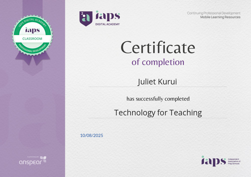 Awarded for completing the Technology for Teaching CPD course from the IAPS Digital Academy.