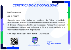Esta badge certifica a conclusão da trilha de Integridade. O participante demonstrou domínio dos conhecimentos essenciais sobre a Política de Brindes e Presentes, Conflito de Interesses e Política Concorrencial, consolidando práticas que reforçam a ética, a conformidade e a transparência nas relações corporativas. Esses pilares são fundamentais para a integridade, a reputação e o sucesso da organização.