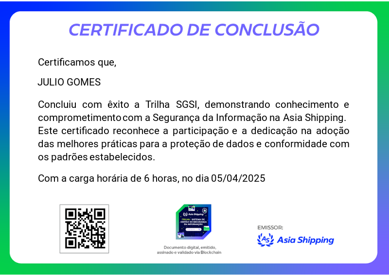Esta badge é concedida aos colaboradores que completaram com sucesso a trilha de cursos sobre Segurança da Informação, demonstrando conhecimento e compromisso com as melhores práticas de proteção de dados e a conformidade com a política de segurança da Asia Shipping.