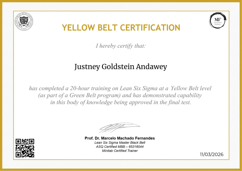 Delving into the intermediate principles of Lean Six Sigma, the Yellow Belt certification provided by MF OPEX, guided by Professor Marcelo Fernandes, marks a significant progression in operational excellence training. Through a meticulously structured curriculum blending advanced theories with practical application, participants deepen their understanding of process optimization, advanced data analysis, and project leadership. Professor Fernandes' renowned expertise enriches the program with cutting-edge methodologies, empowering learners to spearhead impactful improvements within their organizations. Serving as a pivotal milestone in professional development, this certification not only opens doors to larger-scale projects but also fosters the confidence and skills needed to drive transformative change across diverse industry landscapes.