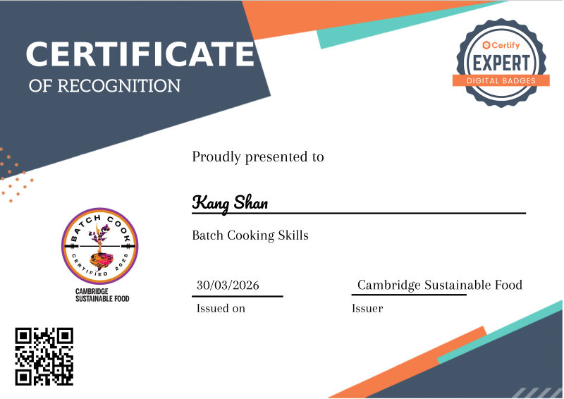 Awarded to participants who attended at least three community-based Batch Cook Club sessions in Cambridge run by Cambridge Sustainable Food CIC. This badge recognises skills in batch cooking, planning healthy meals on a budget, reducing food waste, and working collaboratively in a community kitchen environment.