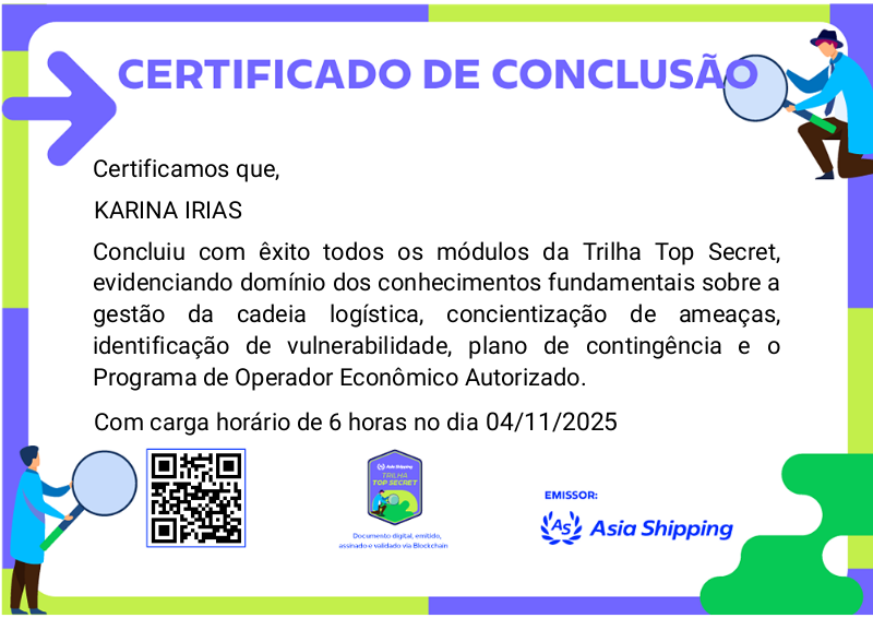 Esta badge certifica a conclusão da Trilha Top Secret. O participante demonstrou domínio sobre conceitos de Gestão da Cadeia Logística, conscientização de ameaças, identificação de vulnerabilidades, plano de Contingência e Programa de Operador Econômico Autorizado.