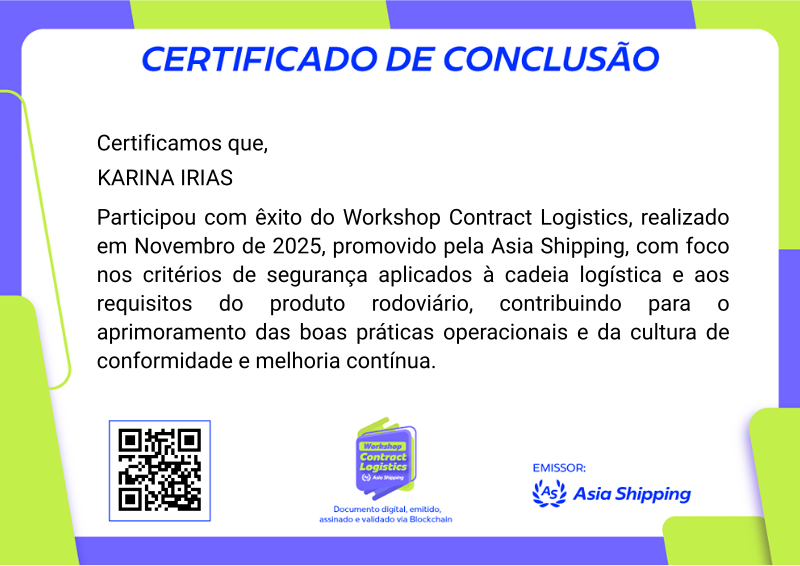 Para receber a Badge do Workshop Contract Logistics, é necessário ter participado do evento realizado em 2025, promovido pela Asia Shipping.