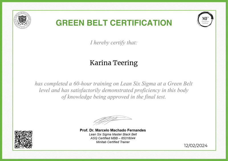 Exploring the principles of Lean Six Sigma, the Green Belt certification offered by MF OPEX, under the mentorship of Professor Marcelo Fernandes, represents a pivotal step forward in operational excellence training. Equipped with an extensive curriculum blending advanced theories with hands-on application, participants not only deepen their understanding of process optimization, advanced data analysis, and project leadership but also become adept at spearheading Lean Six Sigma projects. Professor Fernandes' esteemed guidance enriches the program with cutting-edge methodologies, empowering learners to drive substantial improvements within their organizations. Serving as a significant milestone in professional development, this certification not only qualifies individuals to lead larger-scale projects but also instills the confidence and expertise needed to enact transformative change across diverse industry landscapes.
