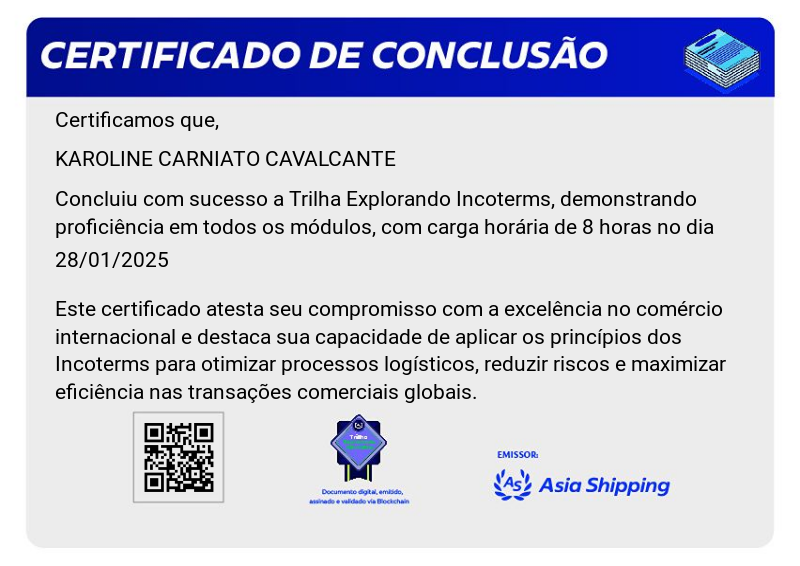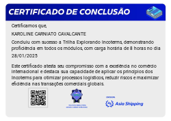 A Trilha Explorando Incoterms inclui elementos relacionados ao comércio internacional, como ícones representando diferentes termos de Incoterms, símbolos de negócios globais ou elementos que destacam a importância do entendimento dos Incoterms para profissionais envolvidos em transações comerciais internacionais. Essa badge serve como um símbolo de conquista e conhecimento na área de comércio internacional e logística.