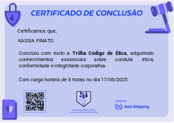 Este badge certifica a conclusão da Trilha Código de Ética. Atesta conhecimento em conduta íntegra, conformidade legal (LGPD, SGSI), anticorrupção e processos de investigação interna, essenciais para a organização.