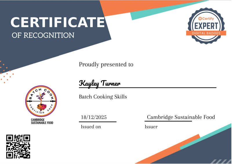 Awarded to participants who attended at least three community-based Batch Cook Club sessions in Cambridge run by Cambridge Sustainable Food CIC. This badge recognises skills in batch cooking, planning healthy meals on a budget, reducing food waste, and working collaboratively in a community kitchen environment.