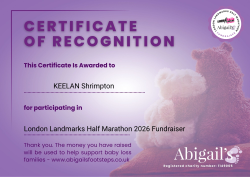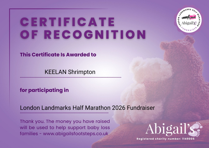 This certificate and badge is awarded in recognition of taking part in the London Landmarks Half Marathon, as part of Abigail’s Footsteps’ largest fundraising event of the year.
