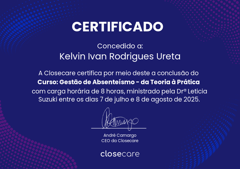 O curso de Gestão de Absenteísmo: da Teoria à Prática aconteceu entre os dias 7 de julho e 8 de agosto. As aulas foram ministradas pela Drª Leticia Suzuki (https://www.linkedin.com/in/leticia-cristina-suzuki-621585131/). O curso foi composto por seis aulas que abordaram os seguintes tópicos: