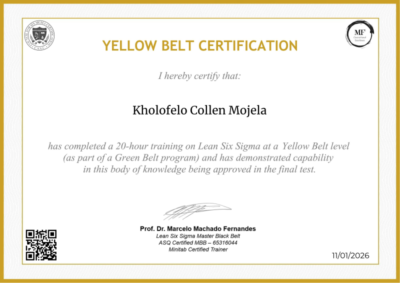 Delving into the intermediate principles of Lean Six Sigma, the Yellow Belt certification provided by MF OPEX, guided by Professor Marcelo Fernandes, marks a significant progression in operational excellence training. Through a meticulously structured curriculum blending advanced theories with practical application, participants deepen their understanding of process optimization, advanced data analysis, and project leadership. Professor Fernandes' renowned expertise enriches the program with cutting-edge methodologies, empowering learners to spearhead impactful improvements within their organizations. Serving as a pivotal milestone in professional development, this certification not only opens doors to larger-scale projects but also fosters the confidence and skills needed to drive transformative change across diverse industry landscapes.