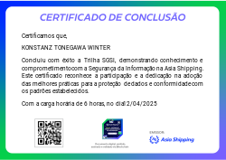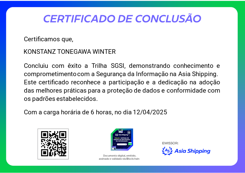 Esta badge é concedida aos colaboradores que completaram com sucesso a trilha de cursos sobre Segurança da Informação, demonstrando conhecimento e compromisso com as melhores práticas de proteção de dados e a conformidade com a política de segurança da Asia Shipping.