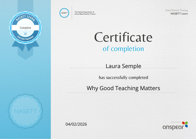 Completed the NASBTT Learn module Why Good Teaching Matters. 1 hour of self-directed learning.