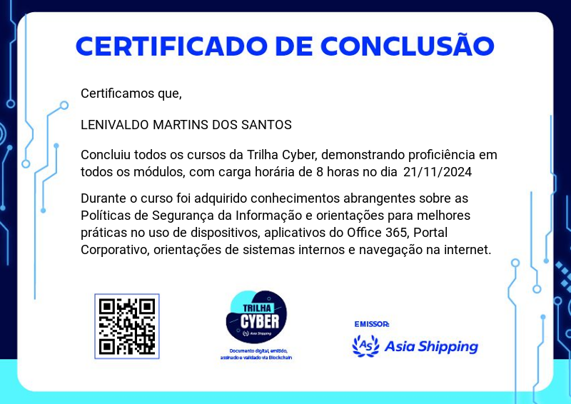 A Trilha Cyber é um dos badges do programa de certificação da Asia Shipping. Ela aborda as melhores práticas de uso dos sistemas internos e do e-mail corporativo, reforçando a segurança e a eficiência no ambiente digital.