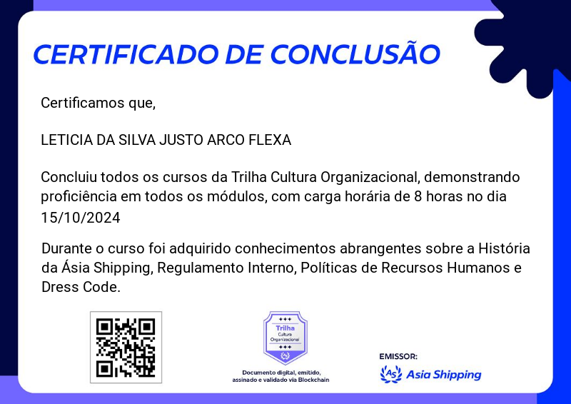 A Trilha Cultura Organizacional é mais um badge do programa de certificação da Ásia Shipping. Nela você terá a oportunidade de conhecer sobre a História da Ásia Shipping, além do Regulamento Interno, Políticas de Recursos Humanos e orientações de Dress Code.