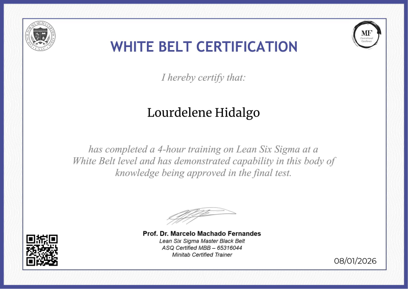 Unlocking the foundational principles of Lean Six Sigma, the White Belt certification offered by MF OPEX, led by Professor Marcelo Fernandes, stands as a beacon of excellence in operational training. Through a comprehensive curriculum blending theory with practical application, participants gain invaluable insights into waste reduction, variation management, and continuous improvement. Professor Fernandes' expertise infuses the program with industry-leading practices, equipping learners with the knowledge and skills to drive tangible improvements within their organizations. Serving as a catalyst for professional growth, this certification paves the way for further advancement in the field of operational excellence, empowering individuals to become agents of positive change in their respective industries.