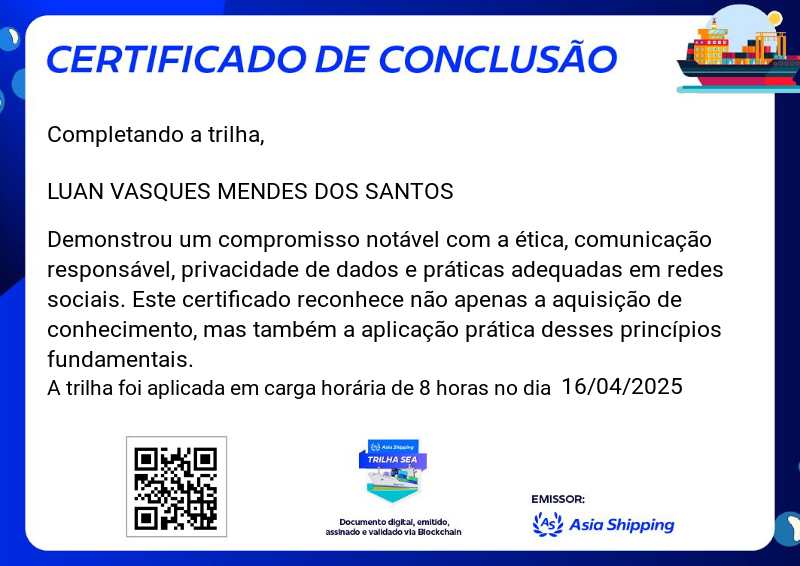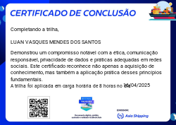 Nessa trilha combinamos temas representativos de Código de Ética, Política de Comunicação Eletrônica Corporativa, Política de Privacidade e Proteção de Dados Pessoais, Guia de Boas Práticas em Redes Sociais e LinkedIn. Esta badge certifica o conhecimento e a conformidade nas práticas essenciais para ética, comunicação corporativa responsável, privacidade de dados e uso adequado das redes sociais.