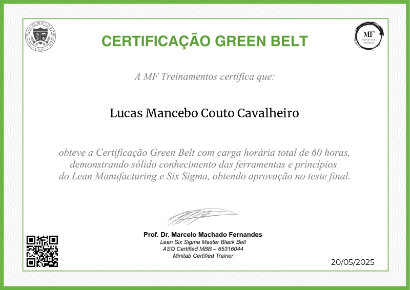 Explorando os princípios do Lean Six Sigma, a certificação Green Belt fornecida pela MF OPEX, sob a orientação do Professor Marcelo Fernandes, representa um avanço significativo no treinamento de excelência operacional. Com um currículo abrangente que mescla teorias avançadas com aplicação prática, os participantes aprofundam sua compreensão em otimização de processos, análise avançada de dados e liderança de projetos. Além disso, os Green Belts estão capacitados para liderar projetos Lean Six Sigma, guiando equipes por iniciativas complexas com confiança e expertise. A orientação estimada do Professor Fernandes enriquece o programa com metodologias de ponta, capacitando os aprendizes a impulsionar melhorias substanciais dentro de suas organizações. Servindo como um marco crucial no desenvolvimento profissional, esta certificação não apenas qualifica indivíduos para liderar projetos em maior escala, mas também incute a confiança e competências necessárias para promover mudanças transformadoras em diversos cenários da indústria.