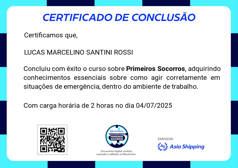 Esta badge digital certifica a conclusão do Treinamento de Primeiros Socorros da Asia Shipping, demonstrando um compromisso proativo com a segurança e a saúde de todos no ambiente de trabalho.