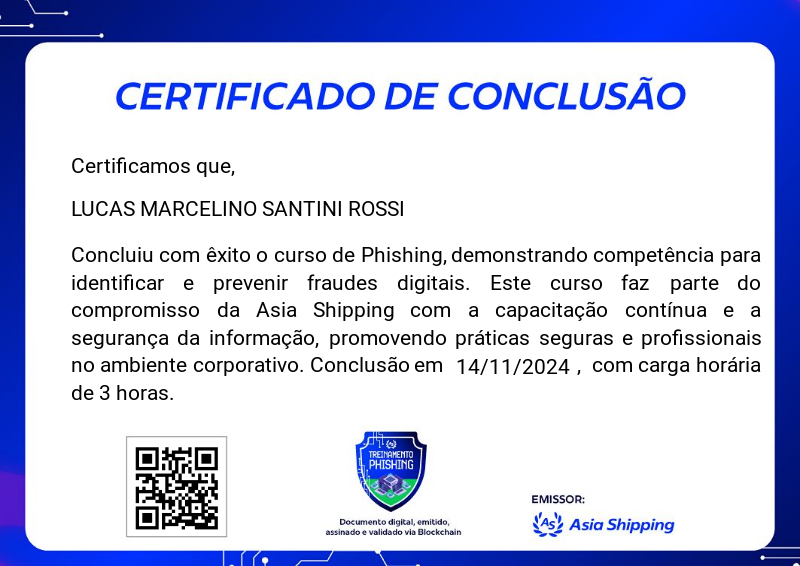 O badge de treinamento em Phishing faz parte do programa de certificação da Asia Shipping e capacita os participantes a reconhecer e evitar tentativas de fraude digital. Com foco em práticas seguras de comunicação e proteção de dados no ambiente corporativo, o treinamento prepara os colaboradores para identificar ameaças e fortalecer a segurança da informação na empresa.