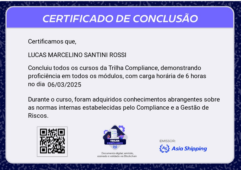 A Trilha Compliance é mais uma Badge do programa de certificação da Asia Shipping. Com ela você terá a oportunidade de conhecer mas sobre Compliance na Asia Shipping, como também Gestão de Riscos, suas principais definições e etapas de identificação.