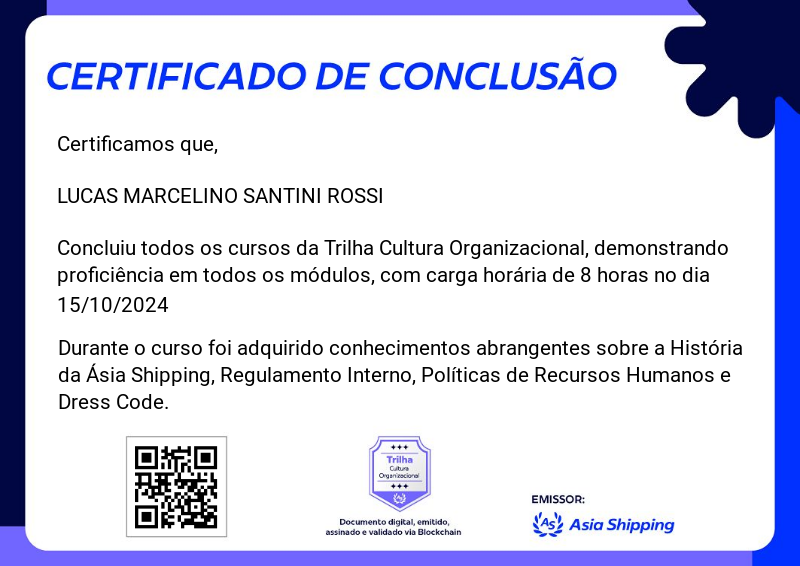 A Trilha Cultura Organizacional é mais um badge do programa de certificação da Ásia Shipping. Nela você terá a oportunidade de conhecer sobre a História da Ásia Shipping, além do Regulamento Interno, Políticas de Recursos Humanos e orientações de Dress Code.