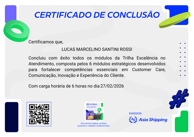 Esta badge certifica a conclusão da Trilha Excelência em Atendimento. O participante desenvolveu habilidades fundamentais para atuar com empatia, proatividade, visão consultiva e excelência no relacionamento com clientes internos e externos.