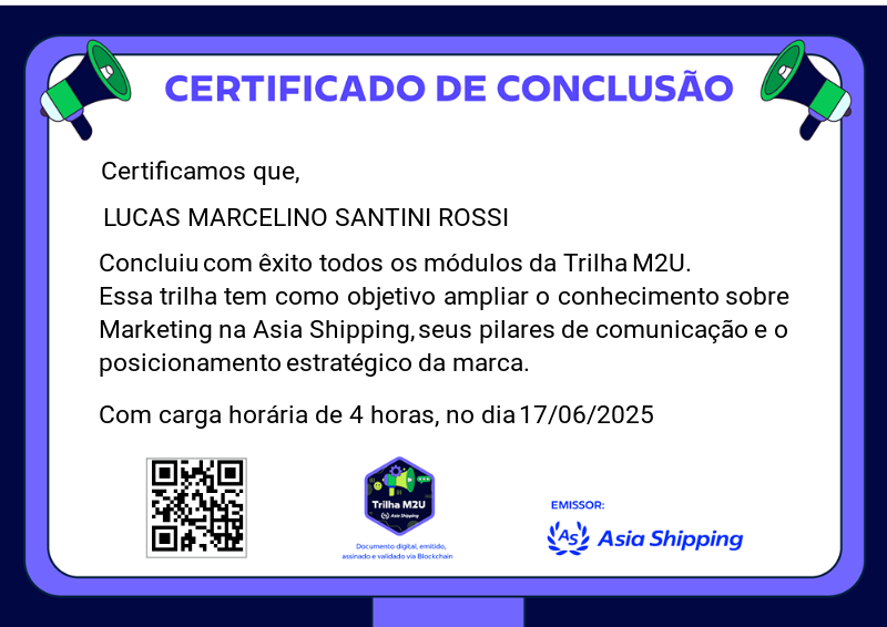 Esta badge é concedida aos colaboradores que completaram com sucesso a Trilha M2U, que teve como objetivo proporcionar uma visão estratégica sobre os pilares da comunicação e do posicionamento da marca, além de fortalecer o entendimento do marketing como ferramenta essencial no contexto organizacional.