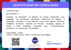 Este Badge Digital reconhece a participação no treinamento em Métodos de Vendas, ministrado por Rafael Dantas, Diretor Comercial na Asia Shipping, abrangendo estratégias avançadas de prospecção, negociação e fechamento. O profissional desenvolveu habilidades em Mindset Comercial, Inteligência Emocional, Expansão de Mercado, Tecnologia aplicada às vendas e Análise Estratégica, aprimorando sua capacidade de gerar valor e maximizar resultados comerciais.