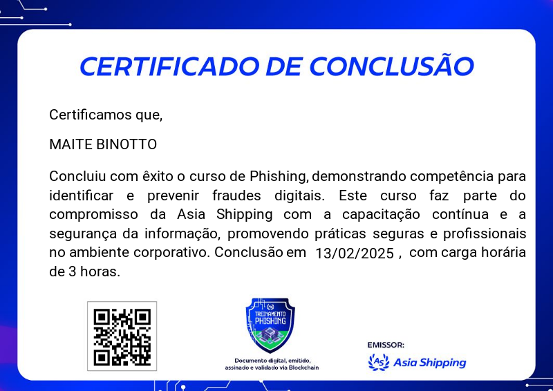 O badge de treinamento em Phishing faz parte do programa de certificação da Asia Shipping e capacita os participantes a reconhecer e evitar tentativas de fraude digital. Com foco em práticas seguras de comunicação e proteção de dados no ambiente corporativo, o treinamento prepara os colaboradores para identificar ameaças e fortalecer a segurança da informação na empresa.