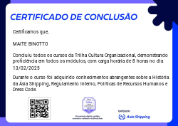 A Trilha Cultura Organizacional é mais um badge do programa de certificação da Ásia Shipping. Nela você terá a oportunidade de conhecer sobre a História da Ásia Shipping, além do Regulamento Interno, Políticas de Recursos Humanos e orientações de Dress Code.