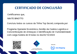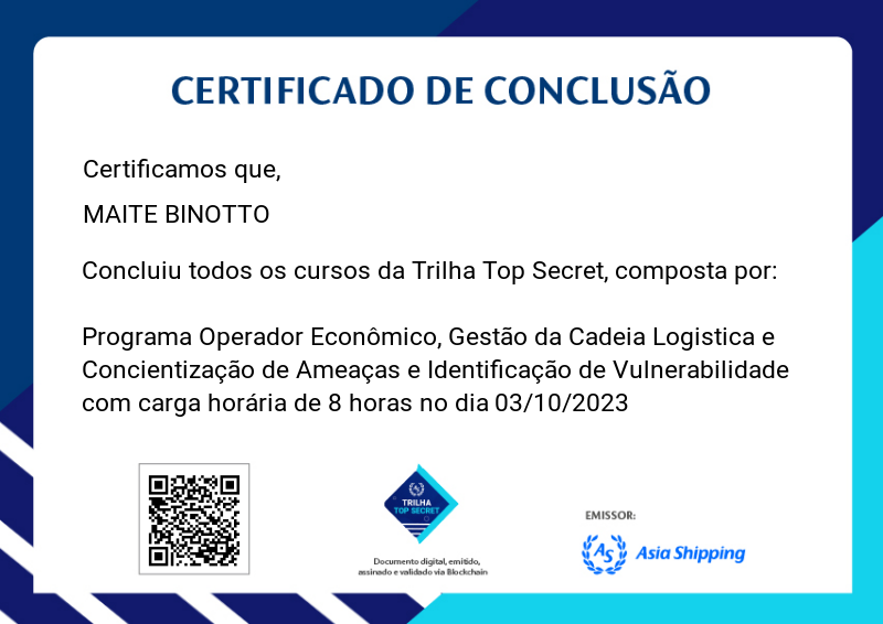 A Trilha Top Secret é mais uma badge do programa de certificação da Asia Shipping. Nela você terá a oportunidade de conhecer fatos importantes sobre toda nossa Gestão da Cadeia Logística, além de informações mais aprofundadas sobre conscientização de Ameaça e Identificação de vulnerabilidades e o Programa de Operador Econômico Autorizado, aplicados em nossa companhia.