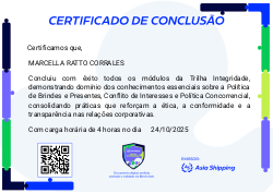 Esta badge certifica a conclusão da trilha de Integridade. O participante demonstrou domínio dos conhecimentos essenciais sobre a Política de Brindes e Presentes, Conflito de Interesses e Política Concorrencial, consolidando práticas que reforçam a ética, a conformidade e a transparência nas relações corporativas. Esses pilares são fundamentais para a integridade, a reputação e o sucesso da organização.