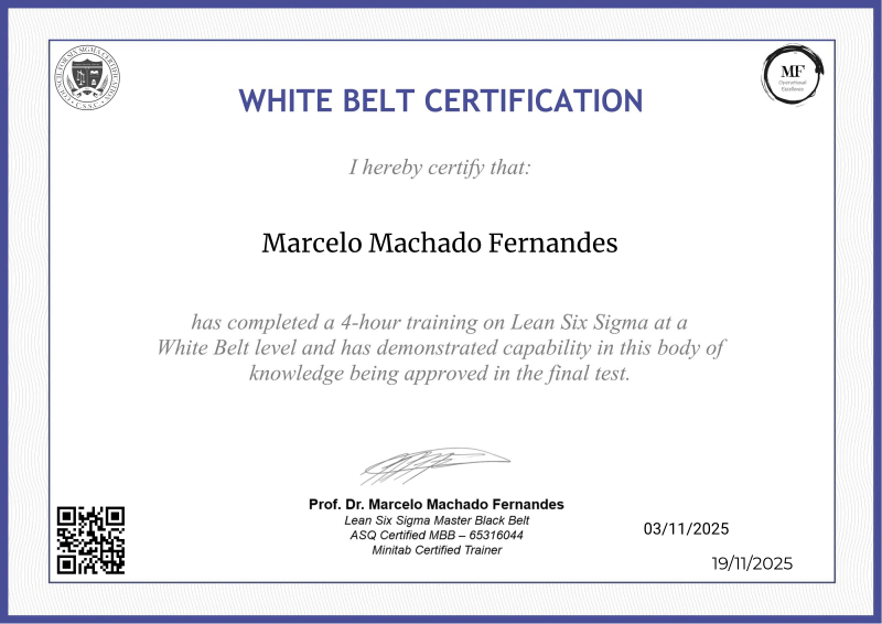 Desbloqueando os princípios fundamentais do Lean Six Sigma, a certificação White Belt oferecida pela MF OPEX, liderada pelo Professor Marcelo Fernandes, destaca-se como um farol de excelência em treinamento operacional. Através de um currículo abrangente que combina teoria com aplicação prática, os participantes adquirem insights inestimáveis sobre redução de desperdícios, gestão de variação e melhoria contínua. A expertise do Professor Fernandes infunde o programa com práticas líderes do setor, equipando os aprendizes com o conhecimento e as habilidades necessárias para impulsionar melhorias tangíveis dentro de suas organizações. Servindo como catalisador para o crescimento profissional, esta certificação abre caminho para avanços adicionais no campo da excelência operacional, capacitando os indivíduos a se tornarem agentes de mudança positiva em suas respectivas indústrias.
