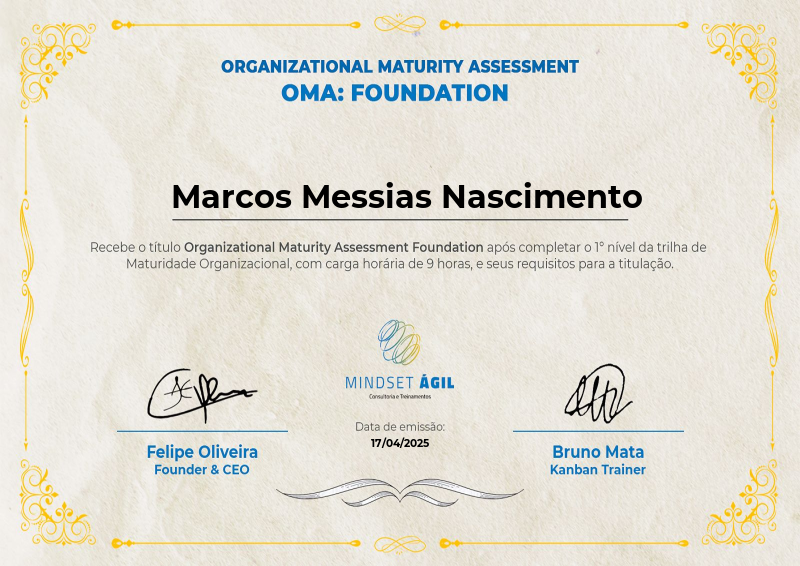 Para receber o certificado Organizational Maturity Assessment Foundation, o/a profissional deve completar uma formação credenciada pela Mindset Ágil®, de 9 horas, participando de todas sessões da formação. Além disso, deve cumprir com todos os deveres relacionados ao trabalho de conclusão, apresentando o case para a turma.