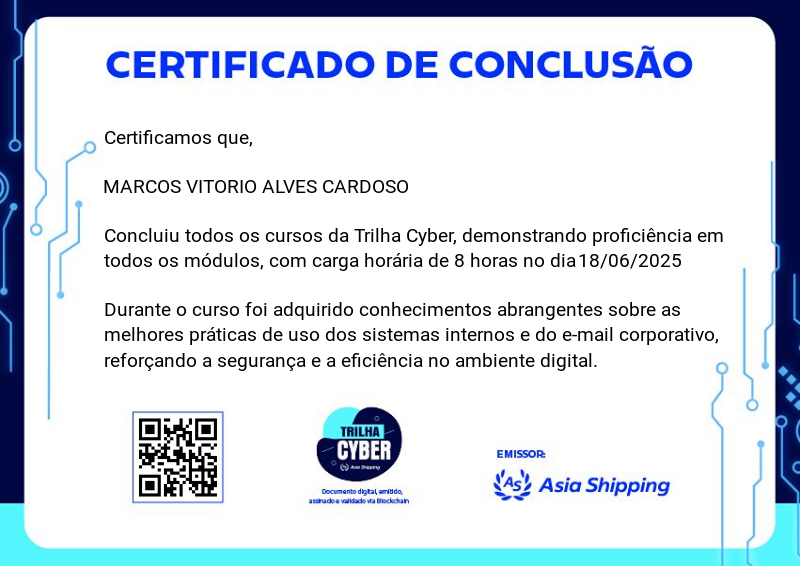 A Trilha Cyber é um dos badges do programa de certificação da Asia Shipping. Ela aborda as melhores práticas de uso dos sistemas internos e do e-mail corporativo, reforçando a segurança e a eficiência no ambiente digital.