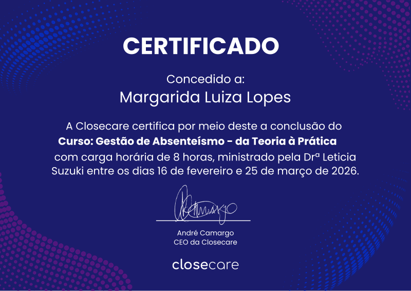 O curso de Gestão de Absenteísmo: da Teoria à Prática aconteceu entre os dias 16 de fevereiro e 25 de março. As aulas foram ministradas pela Drª Leticia Suzuki (https://www.linkedin.com/in/leticia-cristina-suzuki-621585131/). O curso foi composto por oito aulas que abordaram os seguintes tópicos: